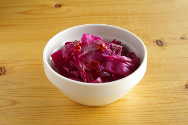 フランス料理の定番のお惣菜で「赤キャベツのマリネ」がありますが、それをイメージして作りました。味のしっかりとした赤キャベツに、酸味の強い赤ワインビネガーを合わせることによりパンチのある味わいのピクルスになっております。ソーセージや豚肉料理の付け合わせにおすすめです。